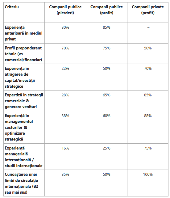 Performanța managerială în companiile publice pare să fie influențată de experiența anterioară în mediul privat: 85% dintre managerii din companiile publice profitabile provin din sectorul privat, față de doar 30% în cele aflate pe pierdere. Dacă includem experiența anterioară în mediul privat, ca un criteriu, ca să îl facem relevant, ar fi util să fie mai specific: ex. Companie având minim o cifră de afaceri de 20 mil Euro, în ultimii 3 ani.